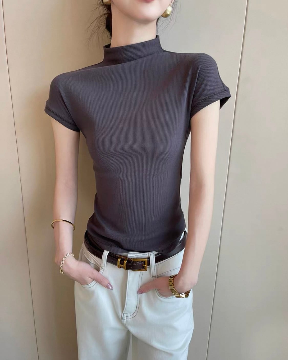 グレー ハイネック ショートスリーブトップス