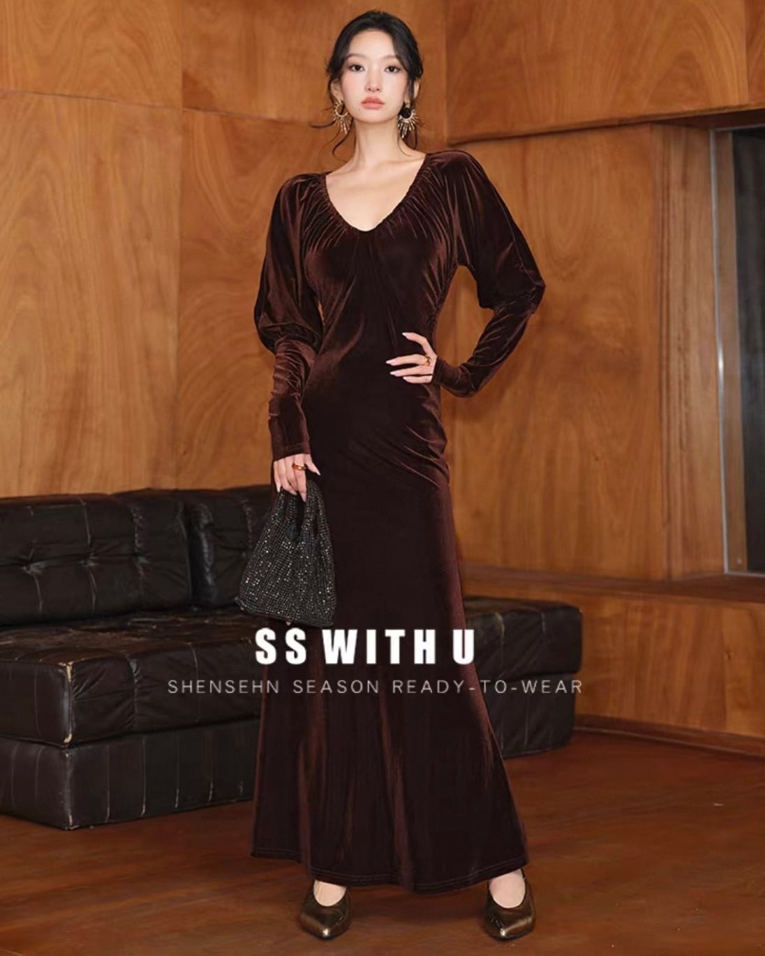 Vネック ベロアワンピース