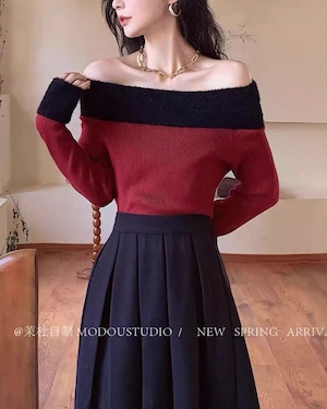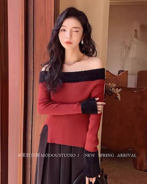 オフショルバイカラー サイドスリットニット