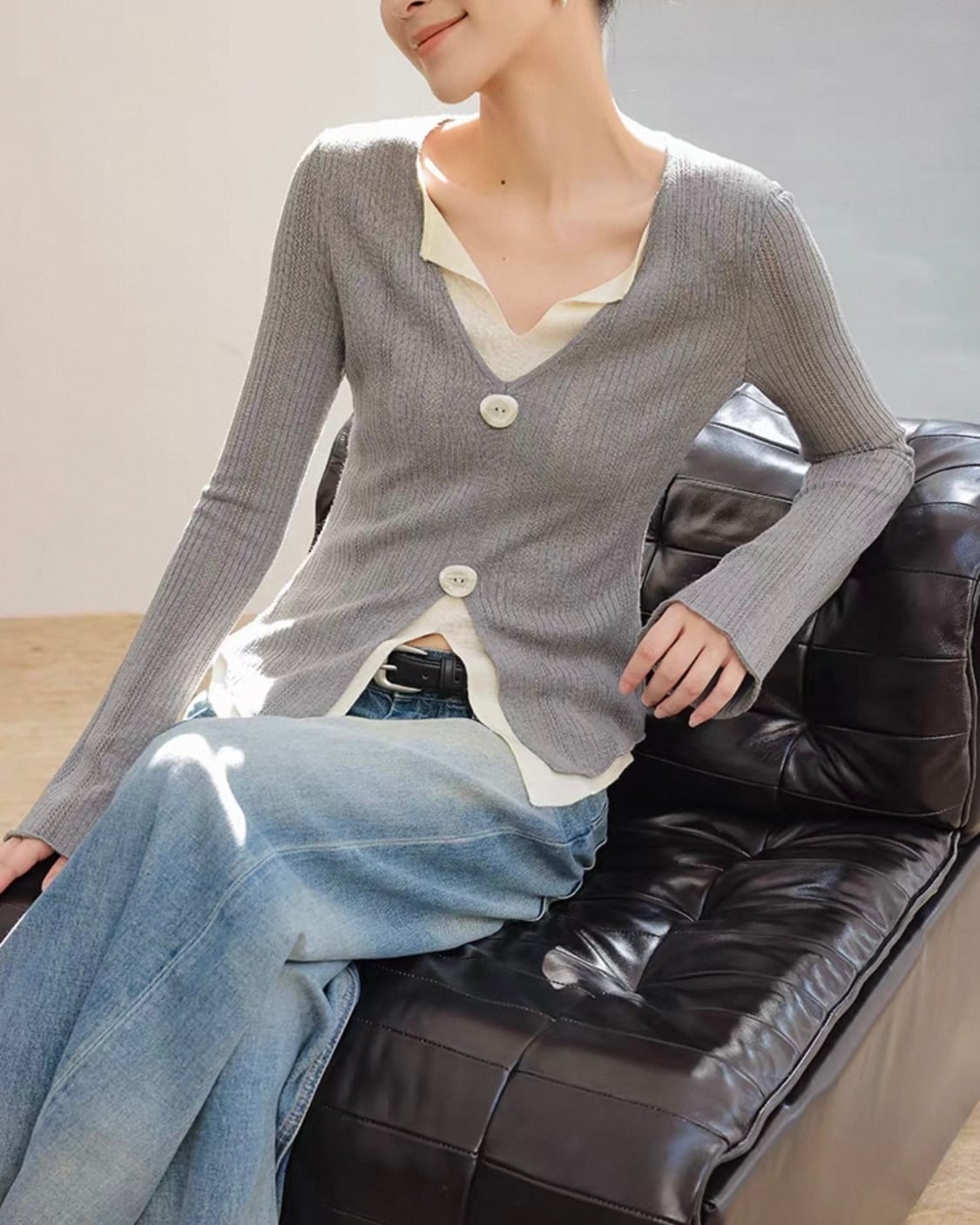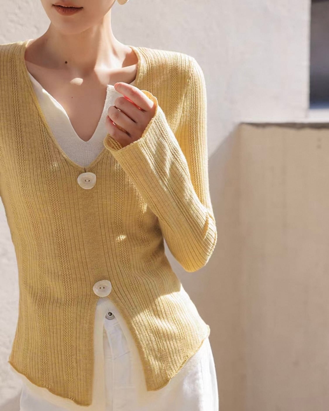 全2色/レイヤード Vネック リブニットトップス