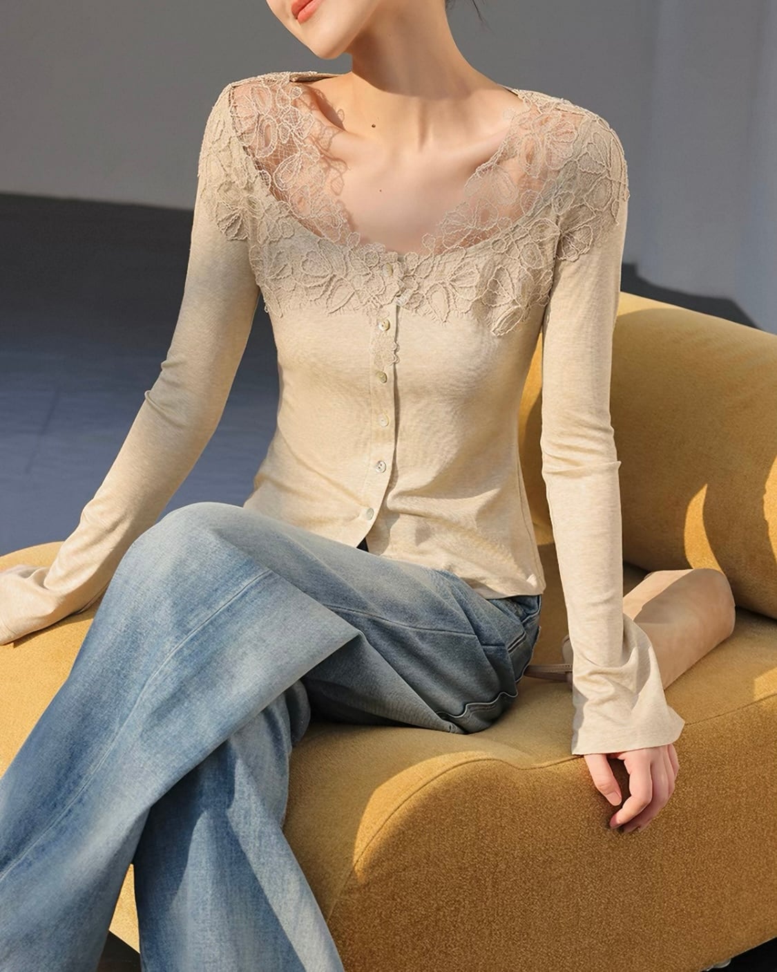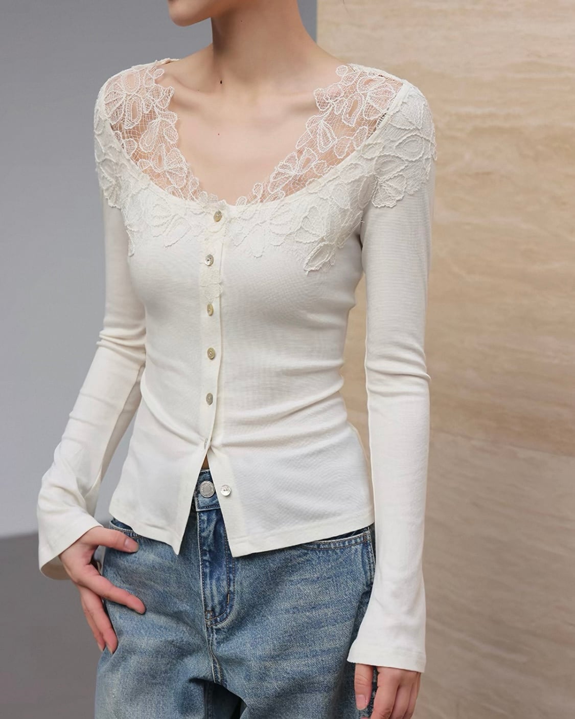 全2色/フラワーレース フロントボタントップス