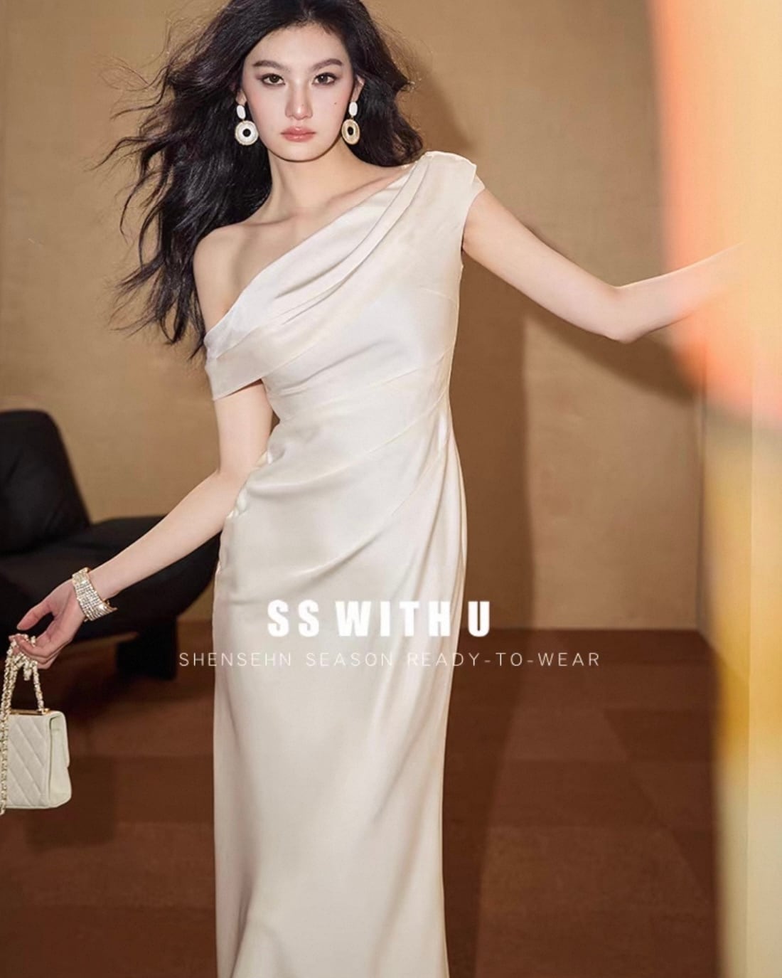 デコルテをきれいに見せてくれる、ワンショルダーデザインのロングワンピース。