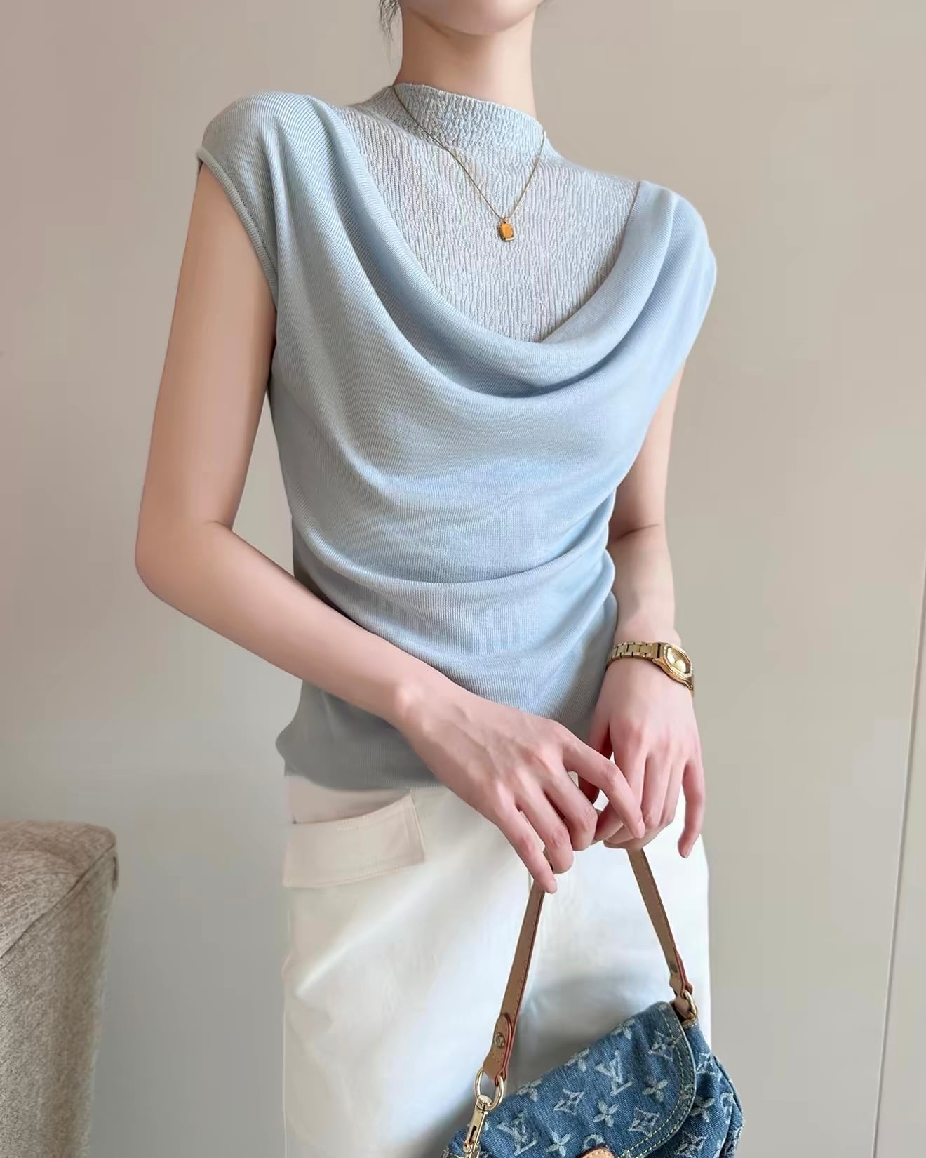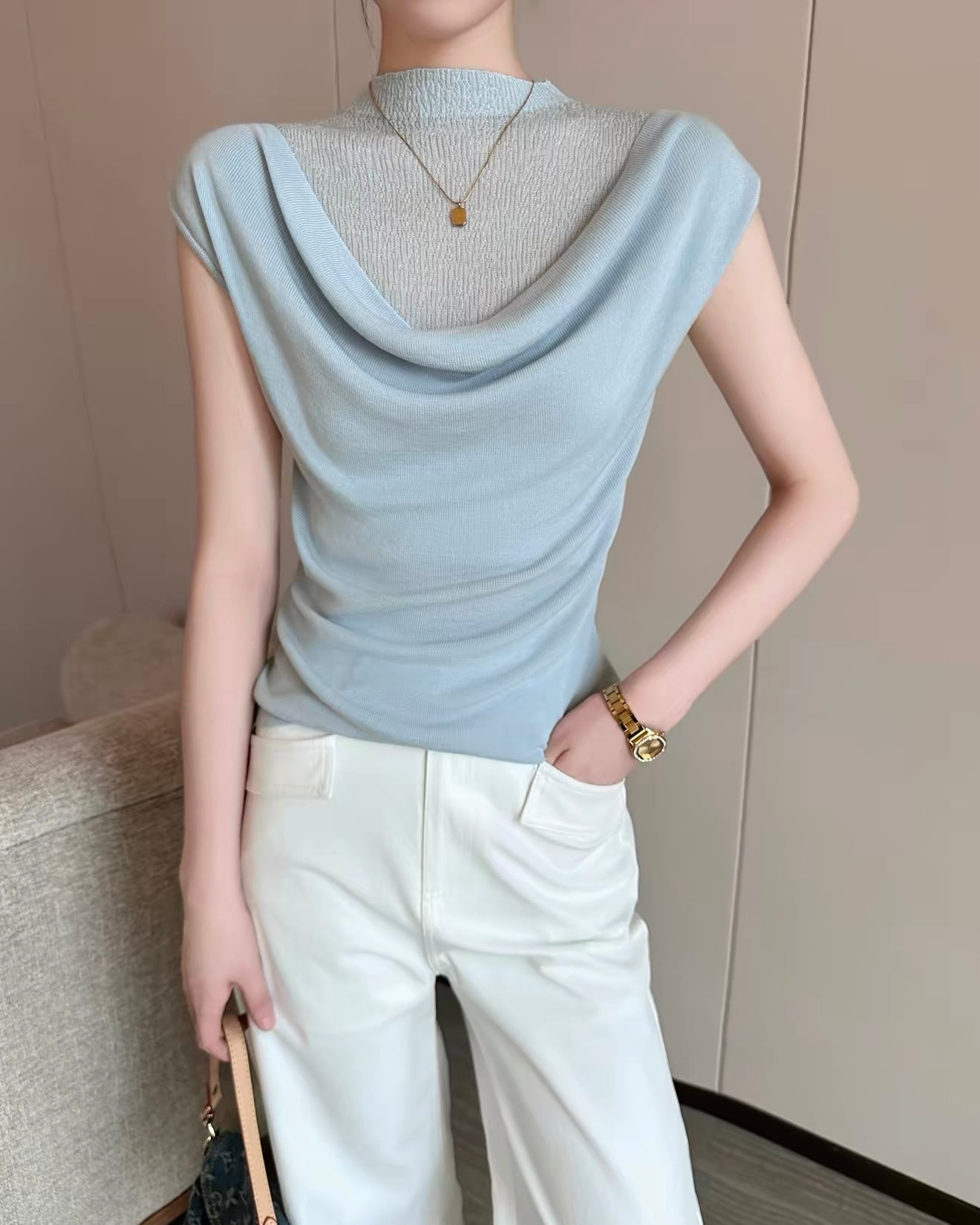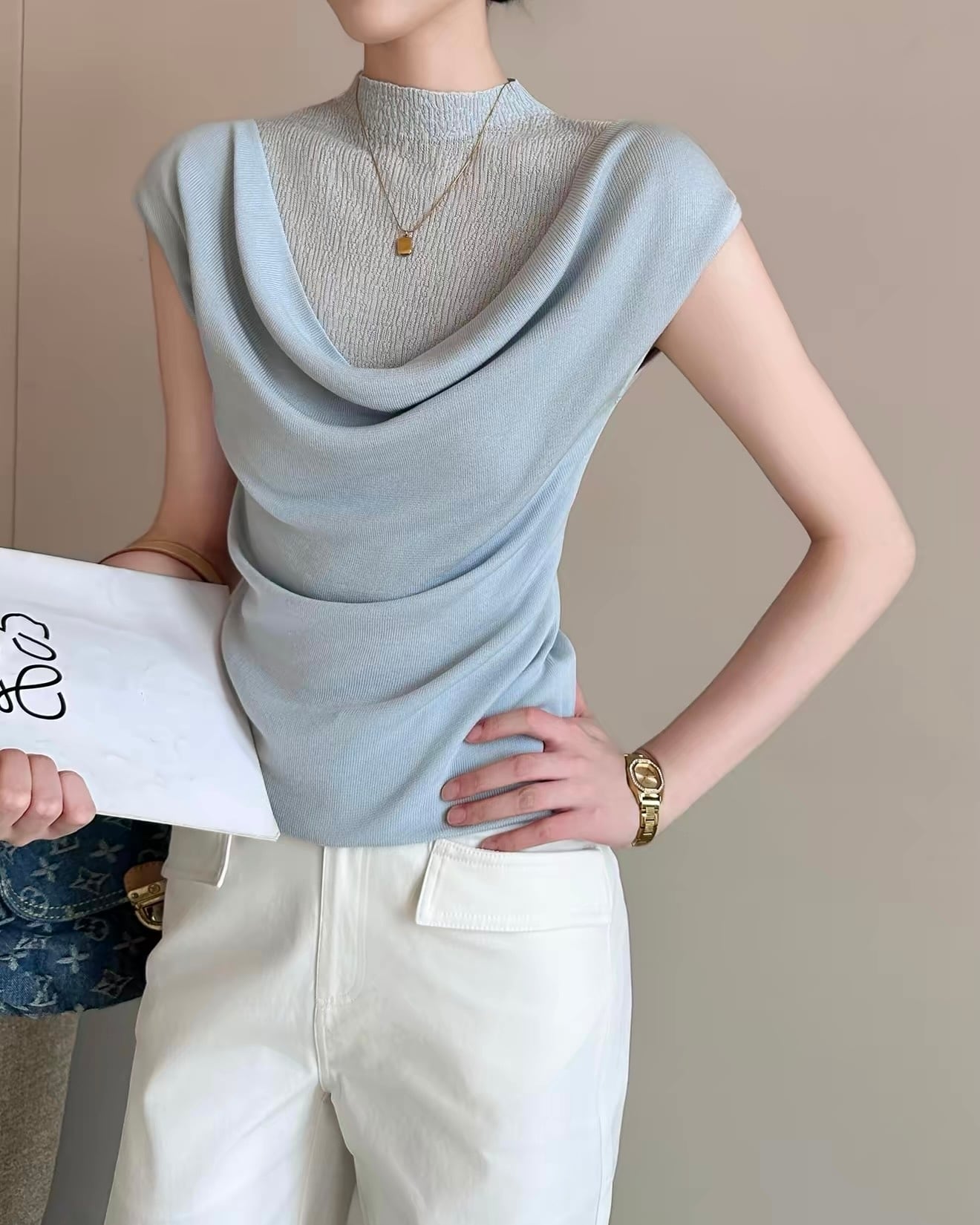 内側はほんのり透け感のあるハイネック、外側はやわらかく落ちるドレープで、