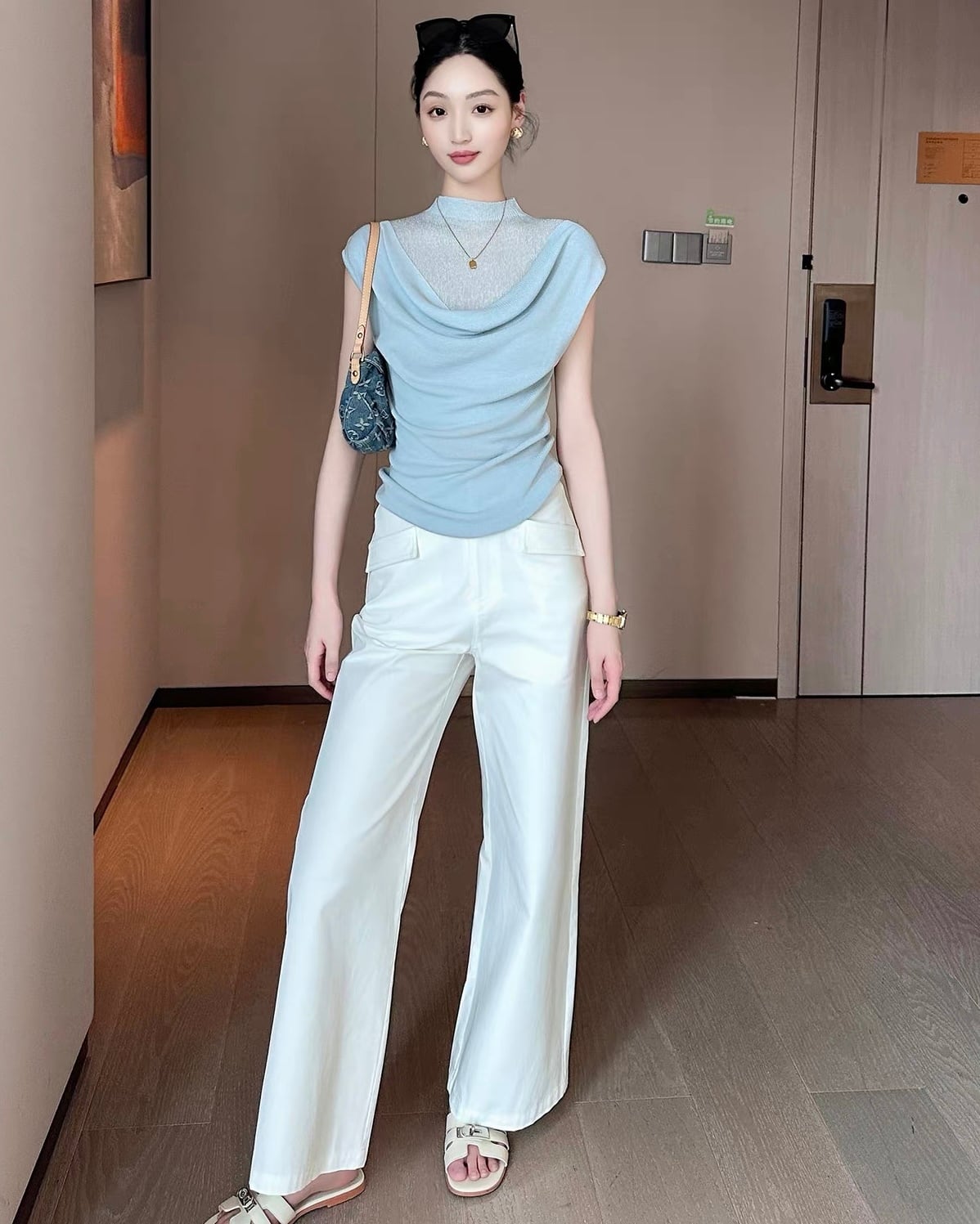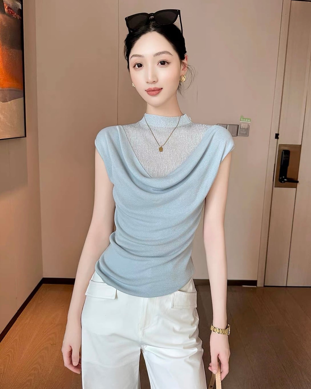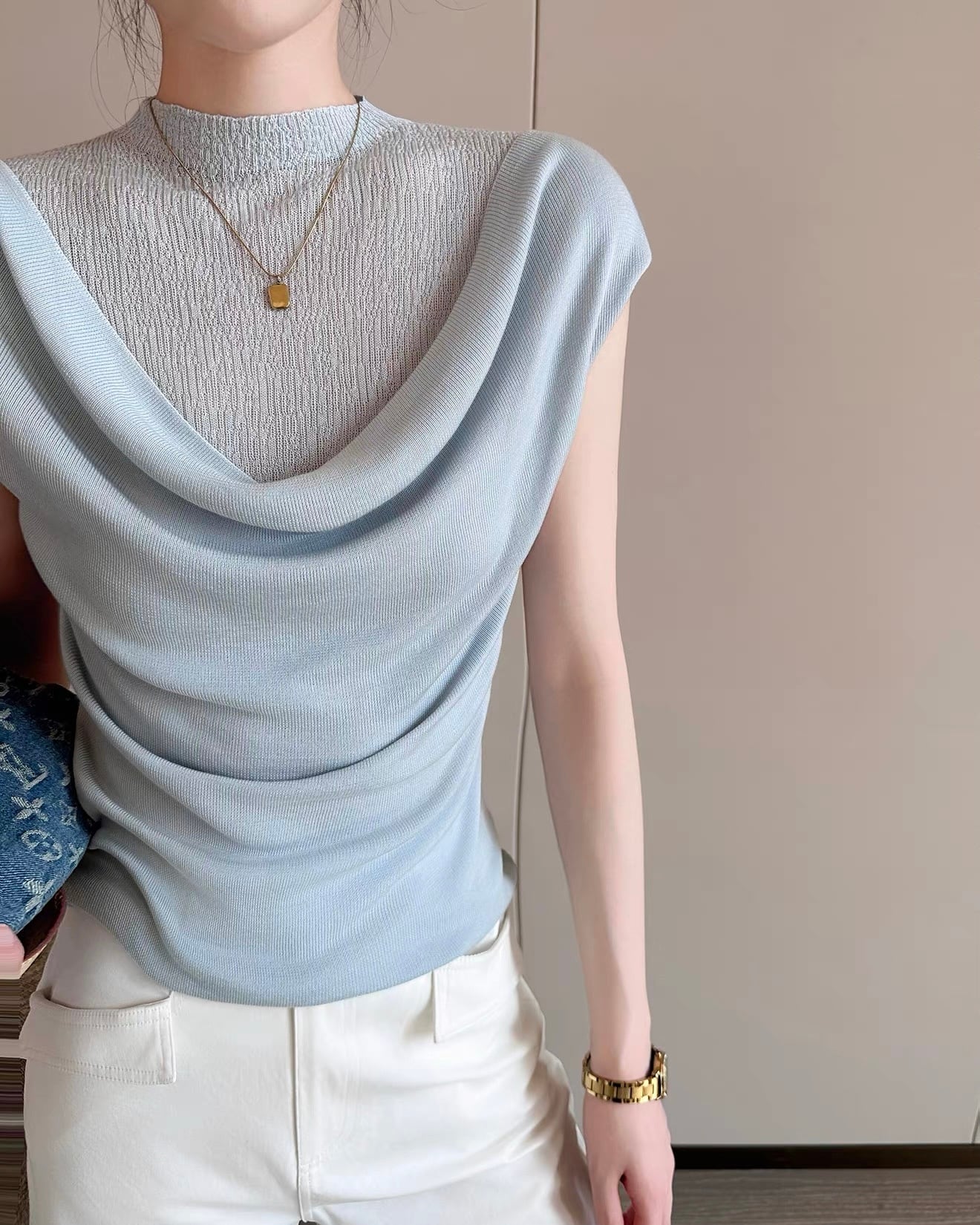 内側はほんのり透け感のあるハイネック、外側はやわらかく落ちるドレープで、