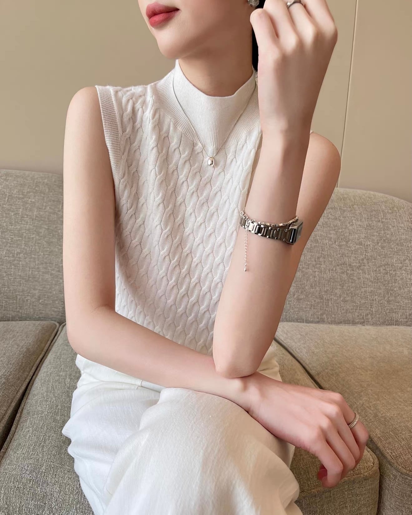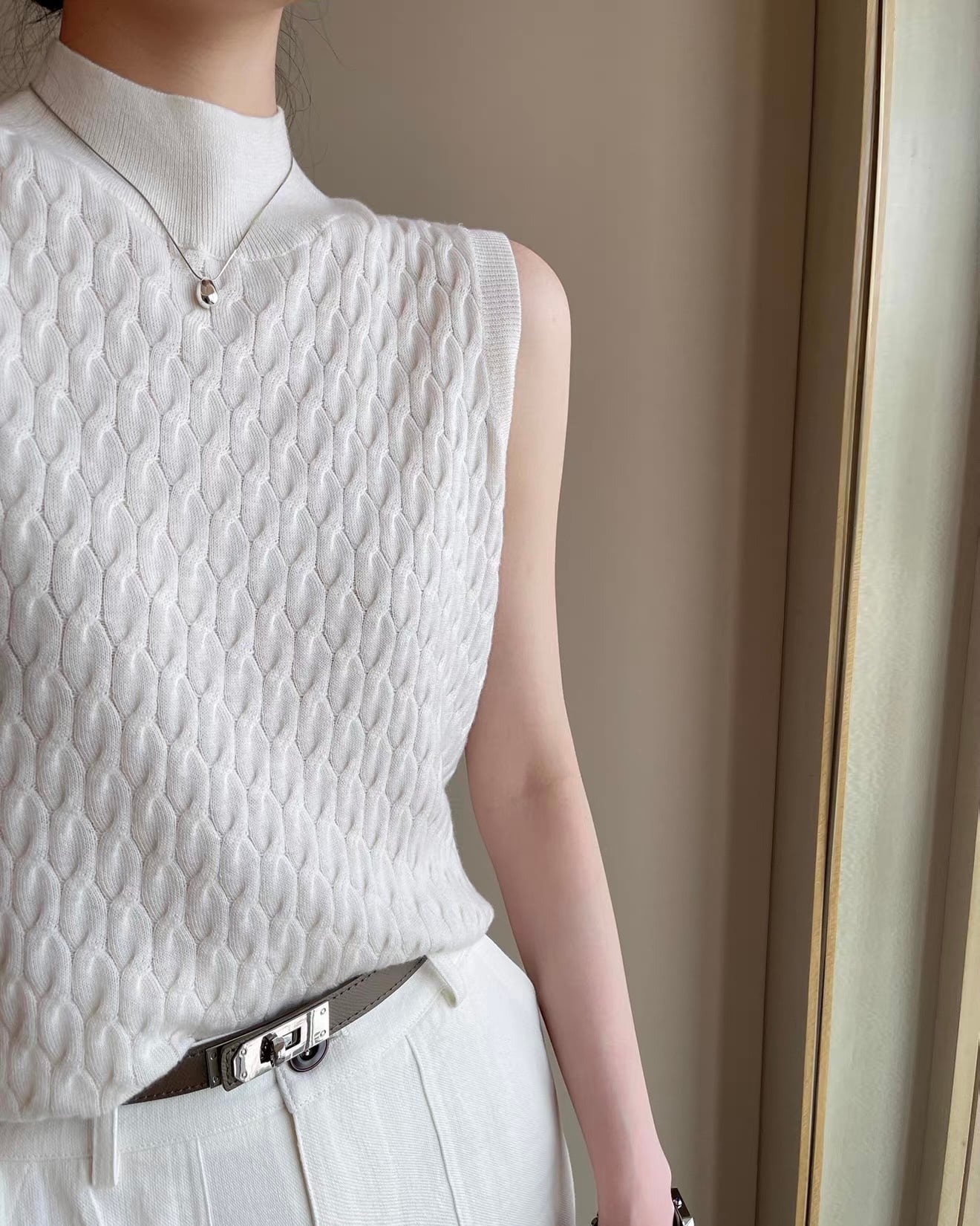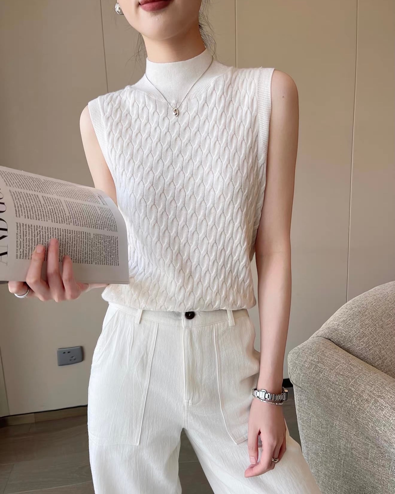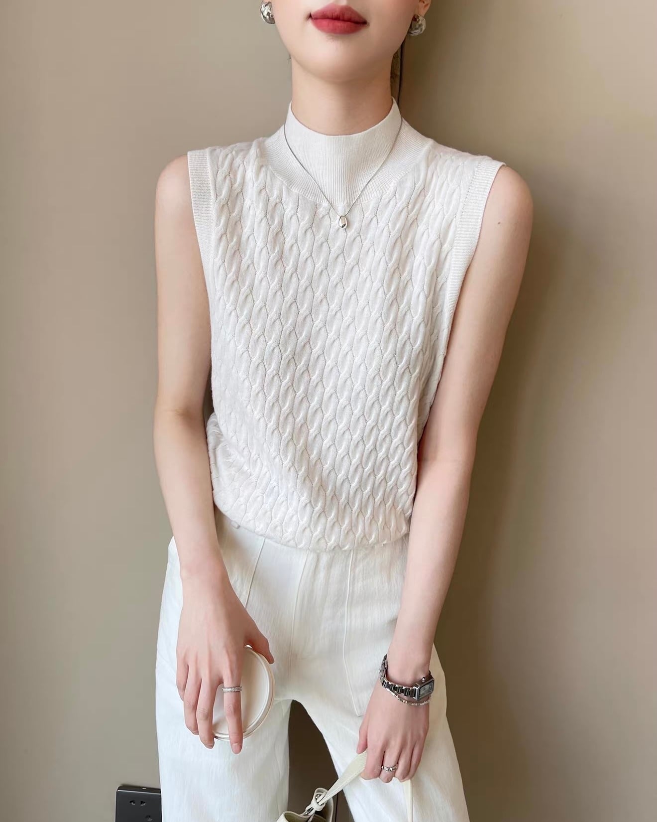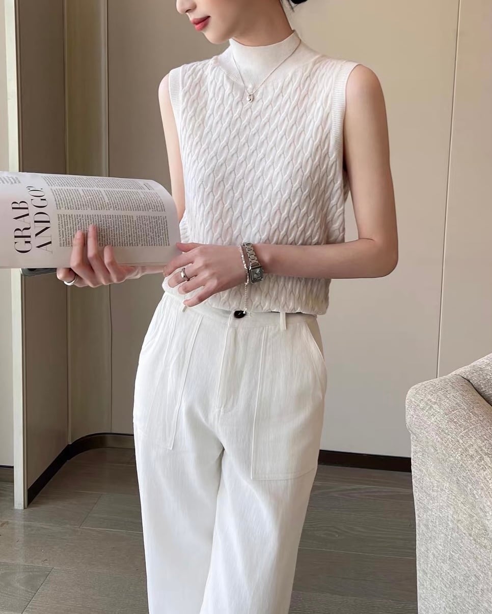 立ち上がりのあるハイネックと、表情のあるケーブル編みが印象的なノースリーブニット。