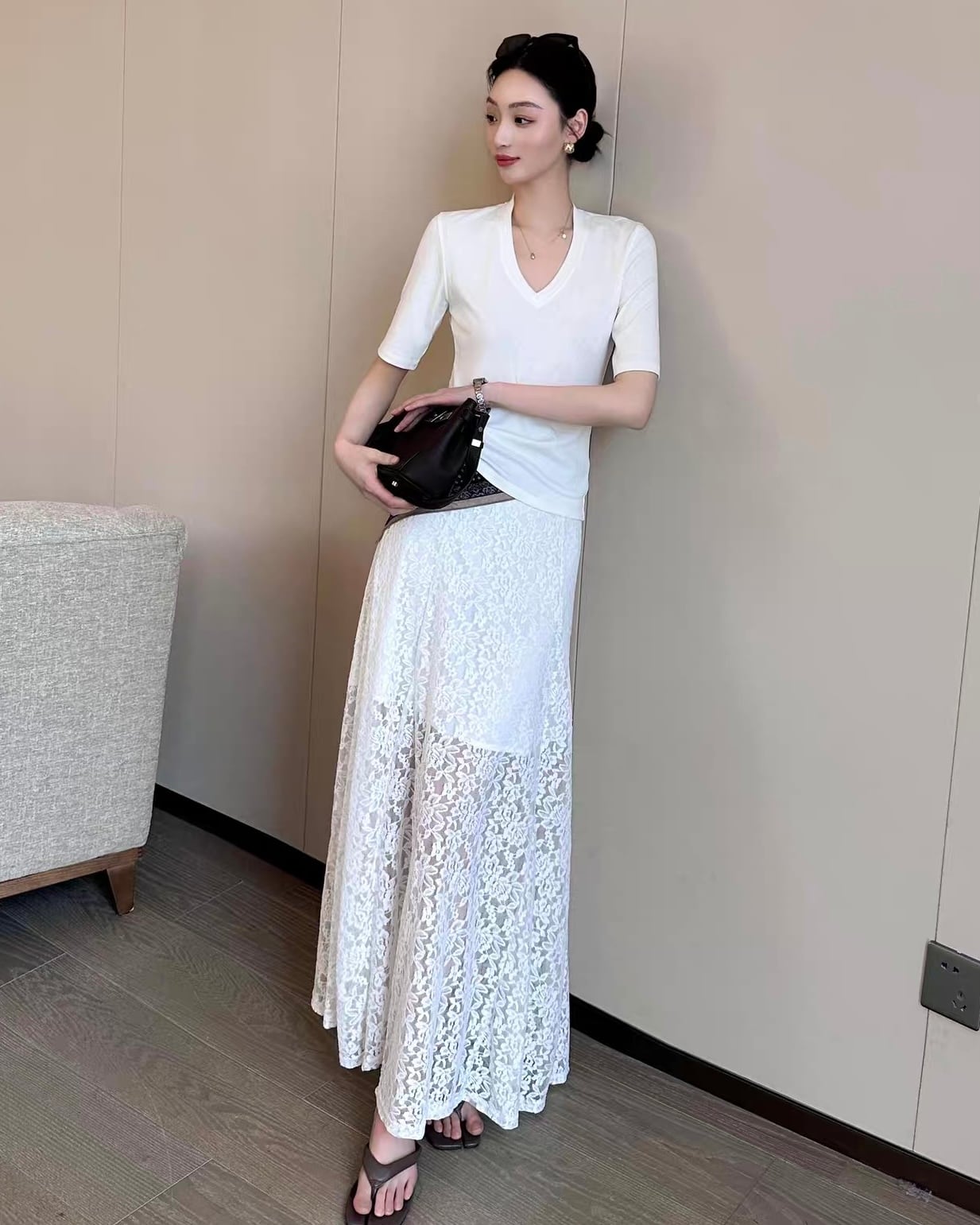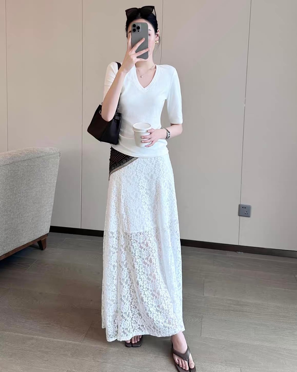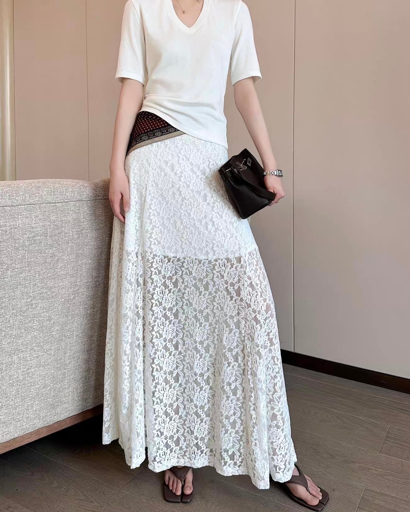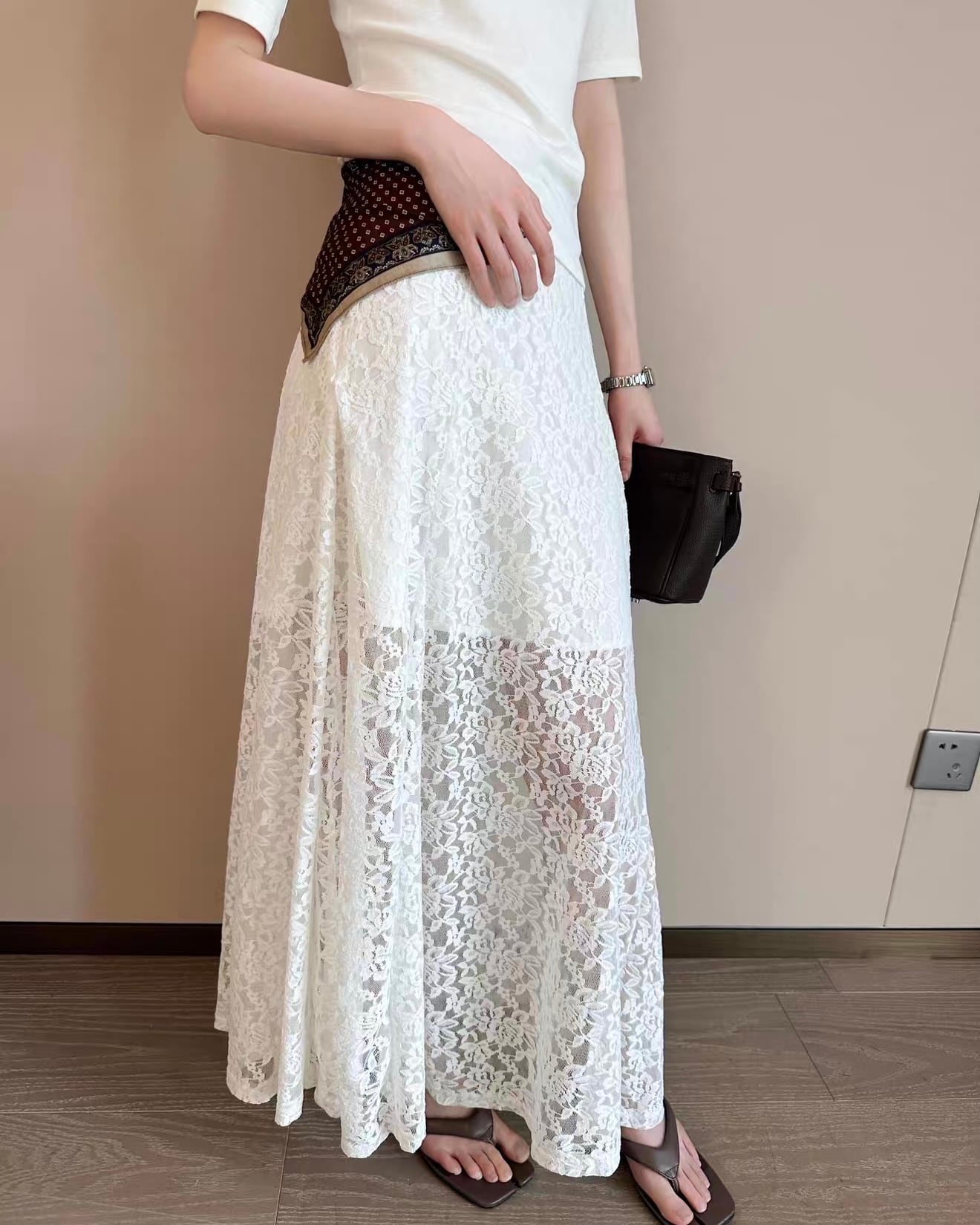 ひざ下から自然に透けるデザインで、軽さと抜け感が出る一枚です。