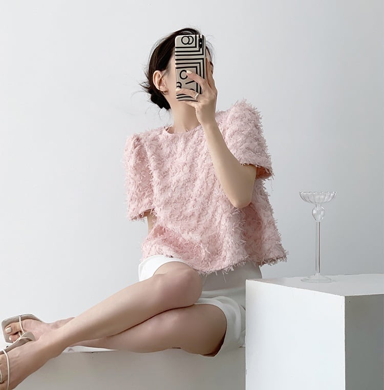 ラウンドネックにフェザーフリンジがアクセントになったトップス。