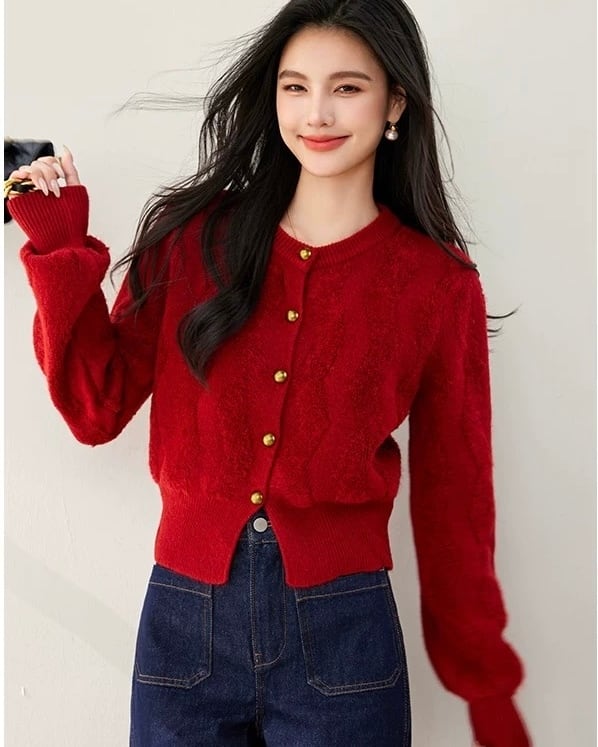 華やかなレッドとゴールドボタンが目を引くニットカーディガンです。