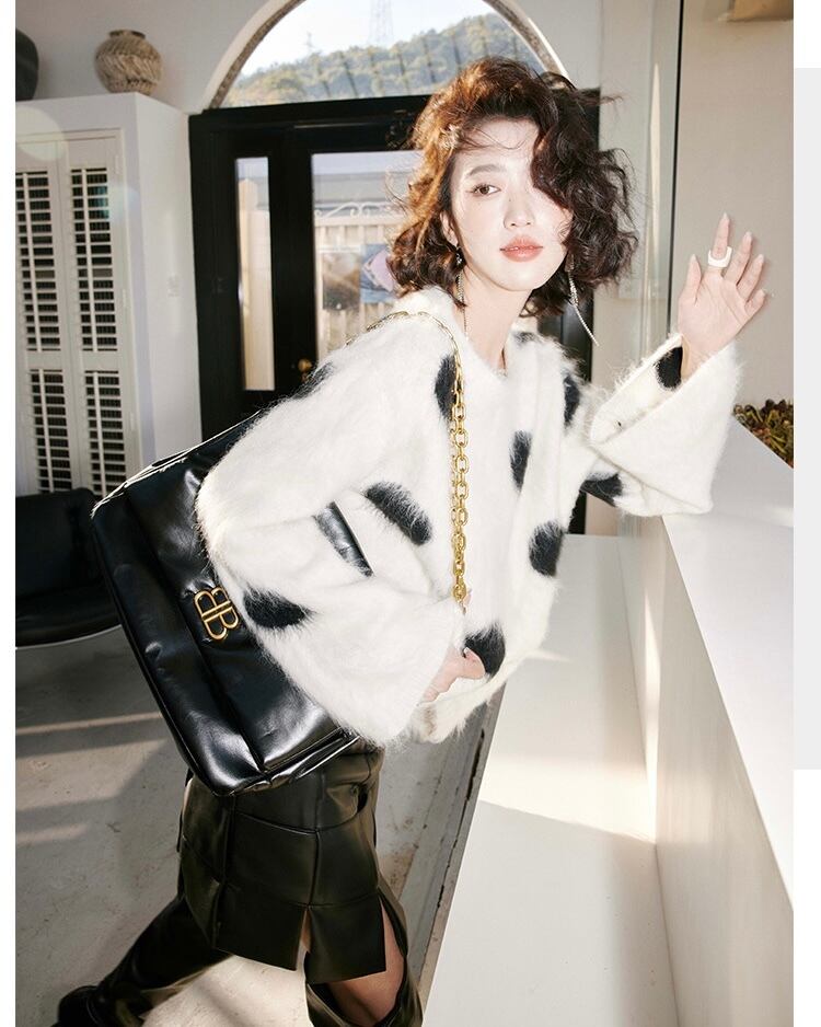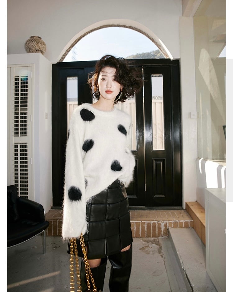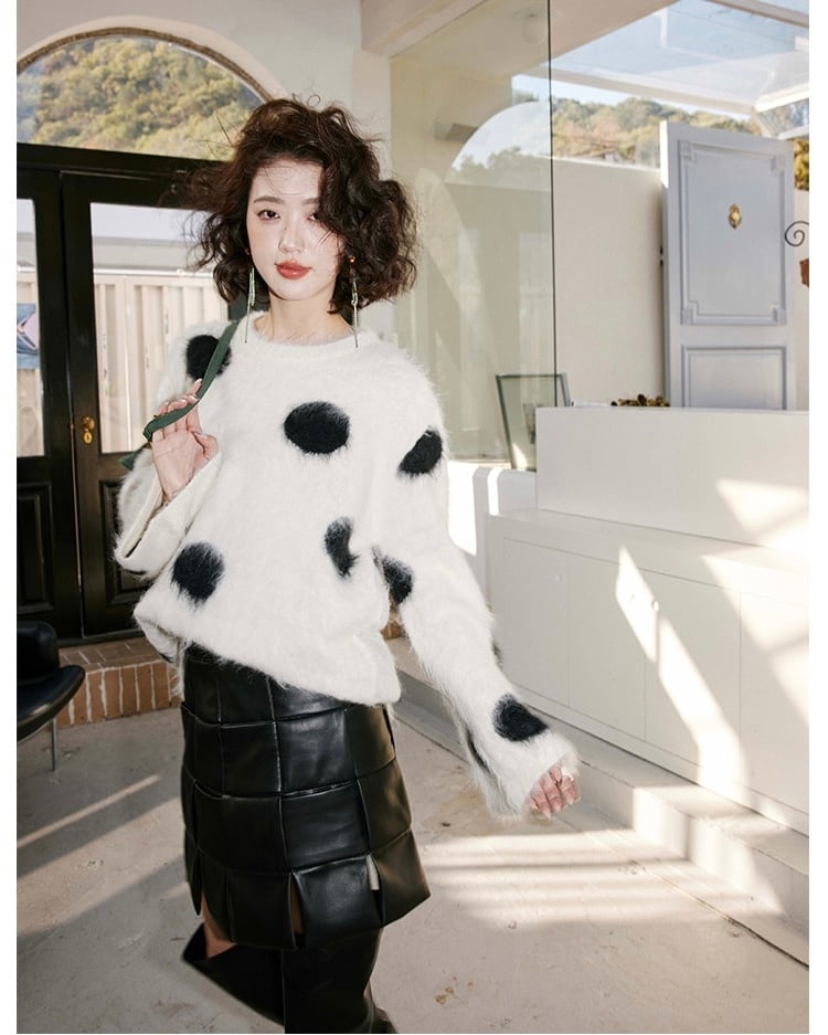 ボリューム感のあるベルスリーブと大人可愛いドット柄が特徴的な、アルパカセーターです。