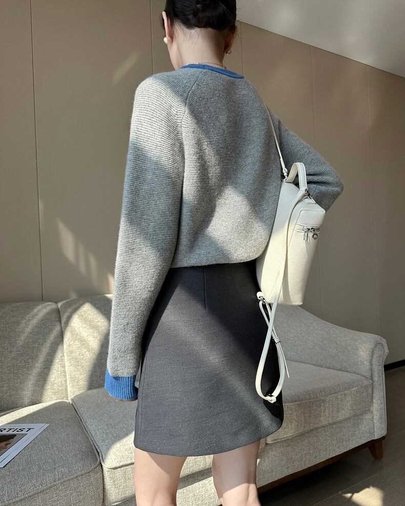 グレーとブルーのコントラストが、シンプルながらも存在感のある一着です。
